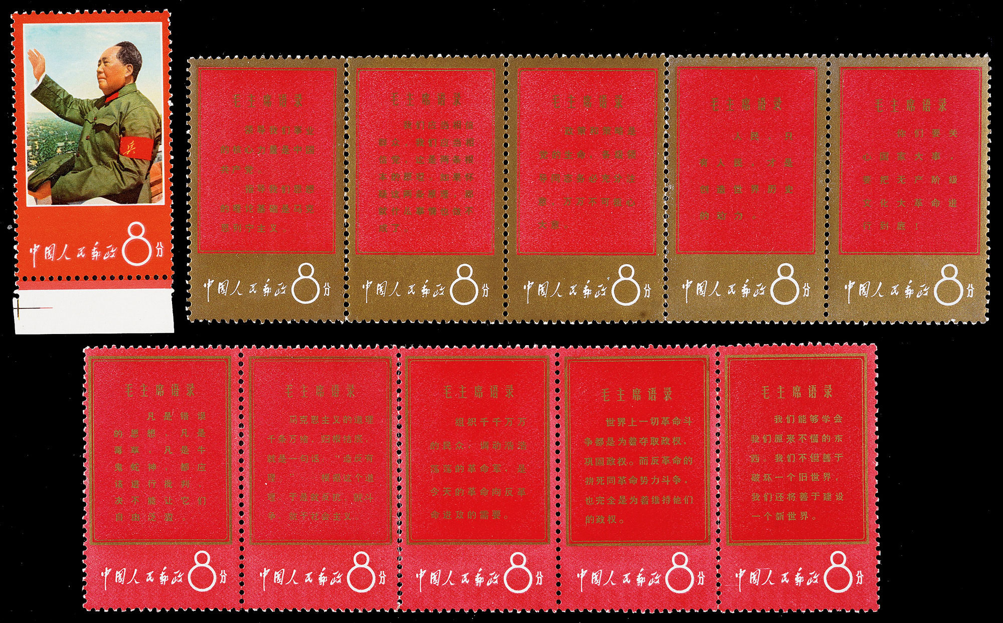 为宣传毛泽东思想,邮电部发行文革系列第一套邮票,全套11枚,其中2-6、7-11分别横五连印。